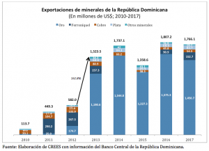 Las exportaciones mineras alcanzaron US$9,337.5 millones de 2010 a 2017, equivalente al 1.80% del producto interno bruto (PIB), mientras las